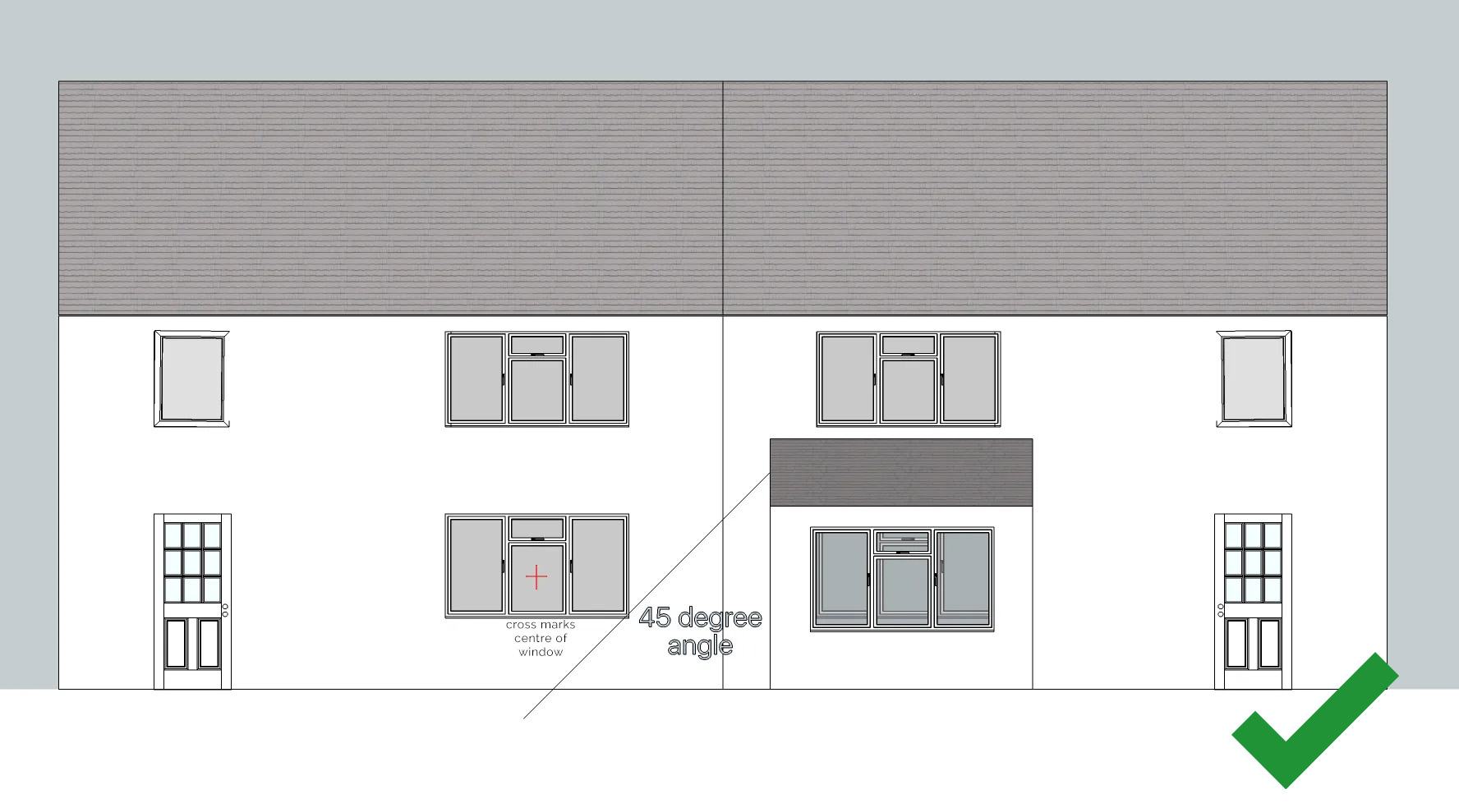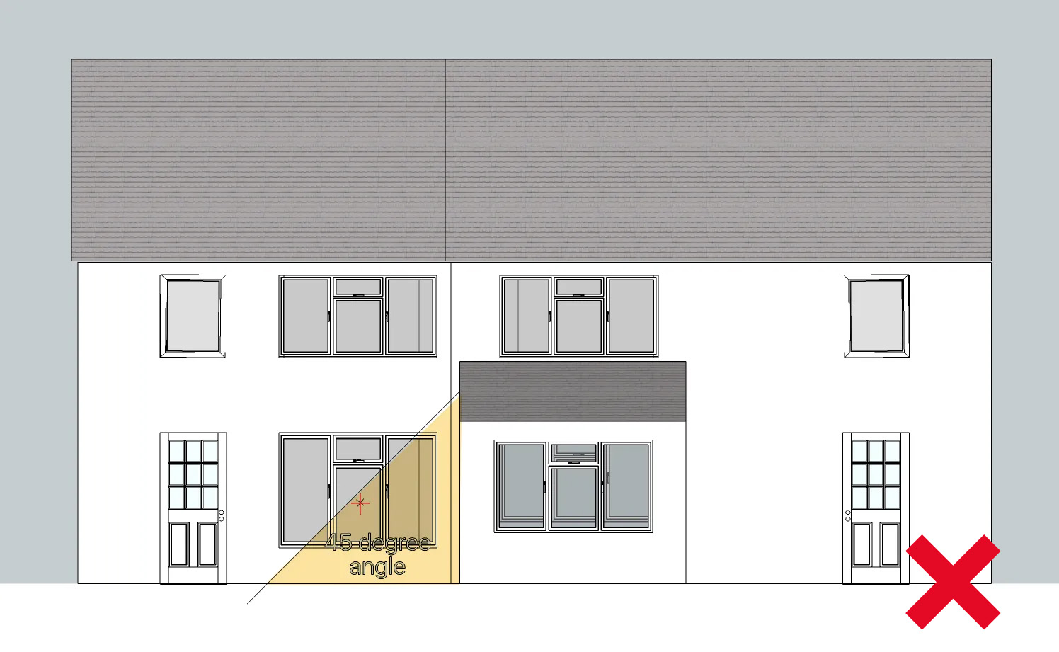 A 45-degree angle line is drawn from the roof edge of the proposed extension towards the neighbouring window. If the roof is sloping, the line should be taken from half way down the roof slope.