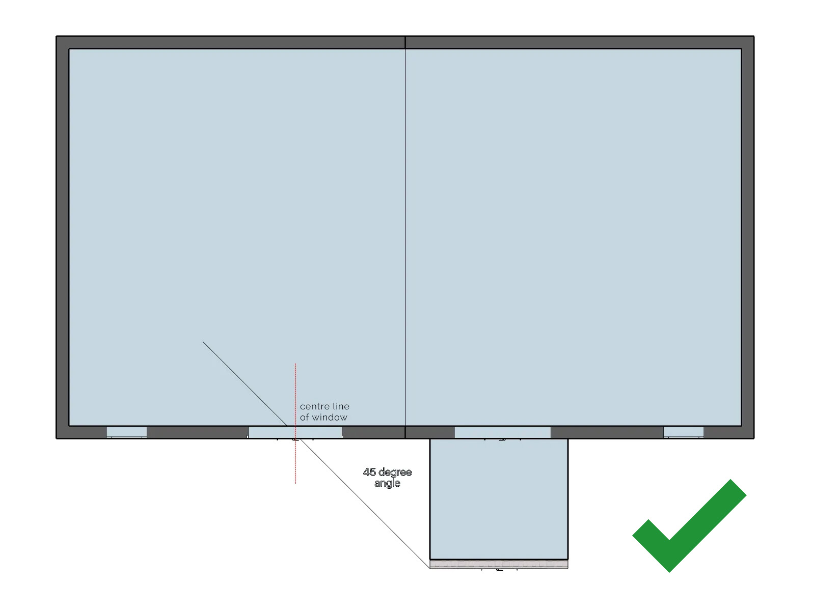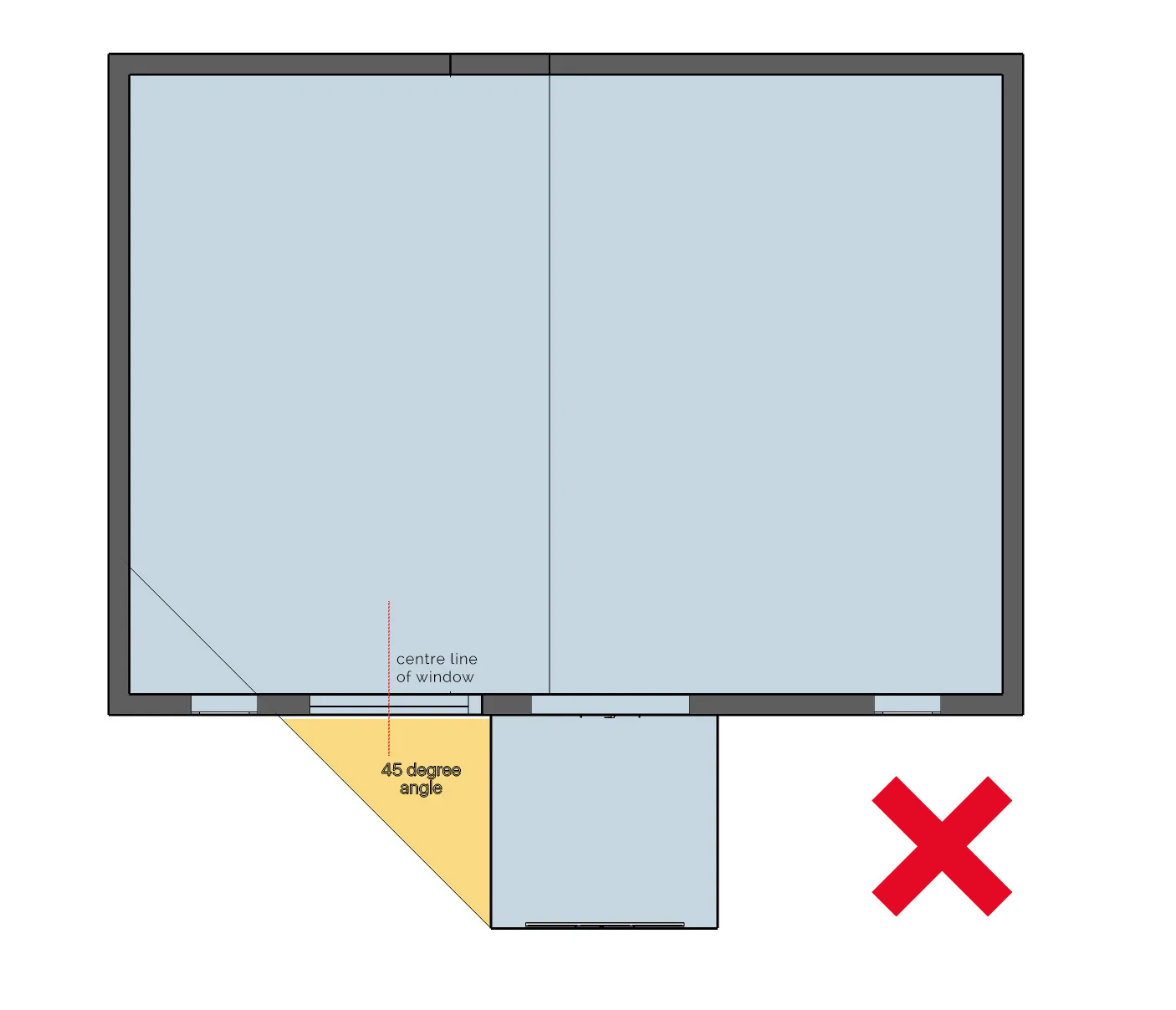 In plan, a 45-degree angle line is drawn from the outer corner of the proposed development/extension towards the neighbouring window that may be affected.