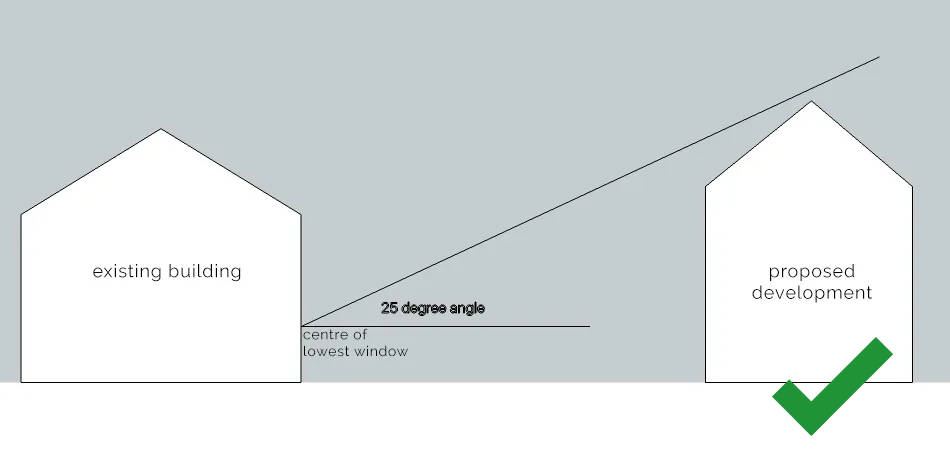 When a 25-degree line is drawn from the centre of the lowest ground floor window of a neighbouring building, the proposed development should not exceed this line in height. The centre of the lowest ground floor window can typically be assumed to be 2m above ground level.