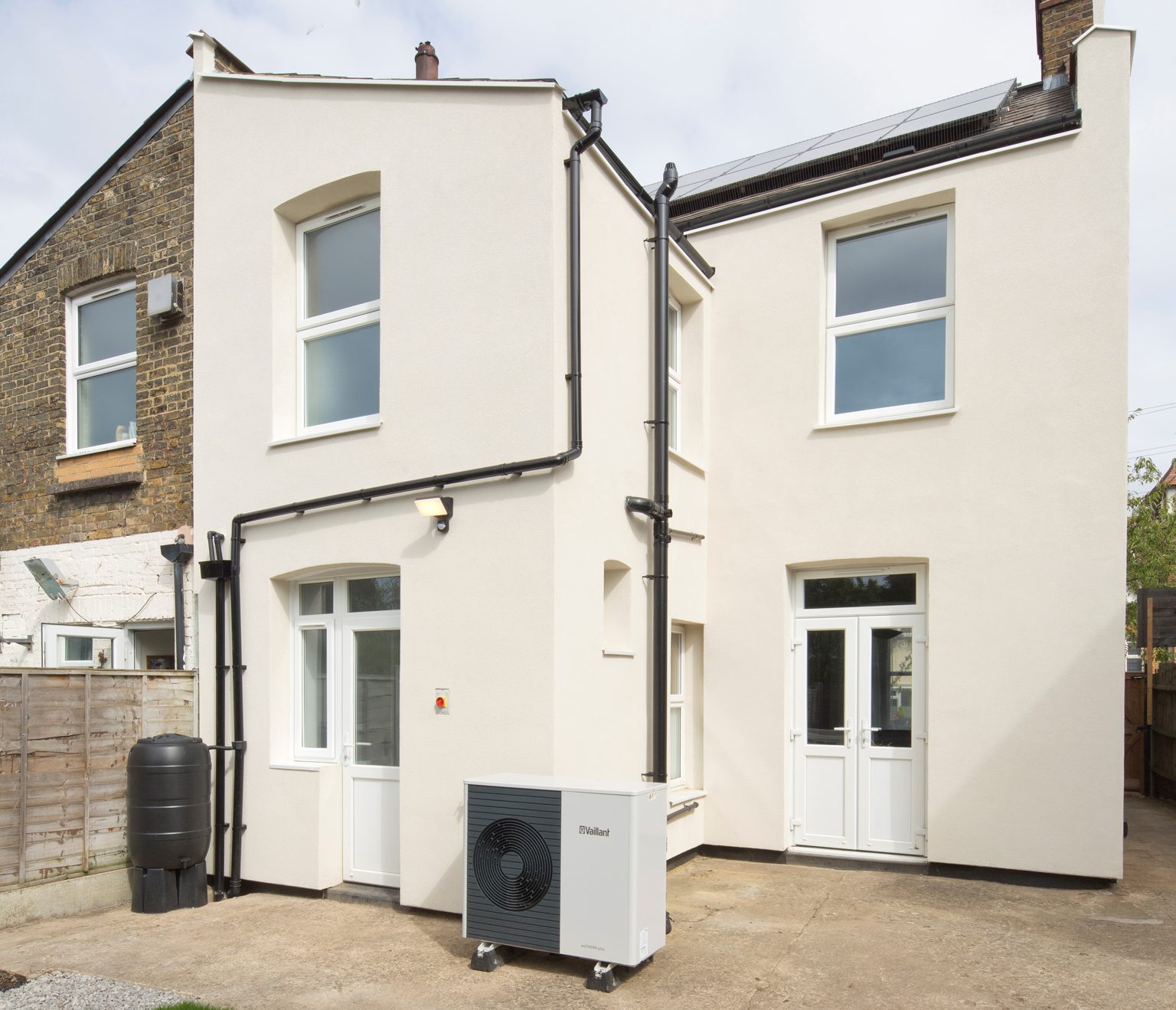 External wall insulation finished with a top coat of render at Greenleaf Road. An increased wall depth meant all rainwater pipes had to be removed and refit