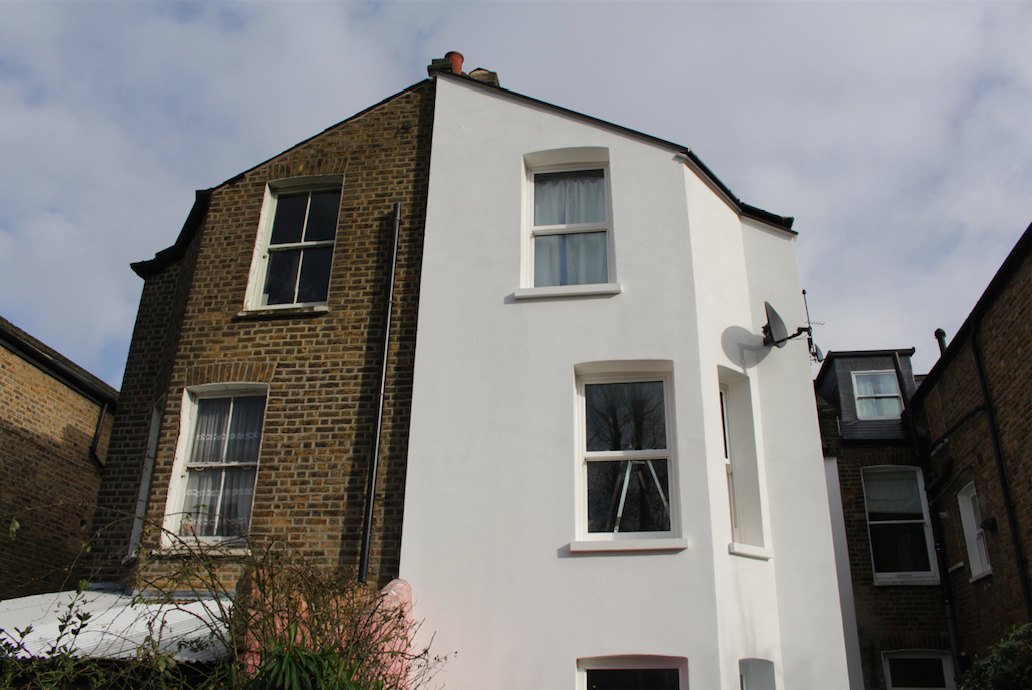 External wall insulation installed to the rear of a house in Brixton. Careful detailing around windows ensures the insulation does not have a detrimental impact on the host dwelling, or neighbouring properties